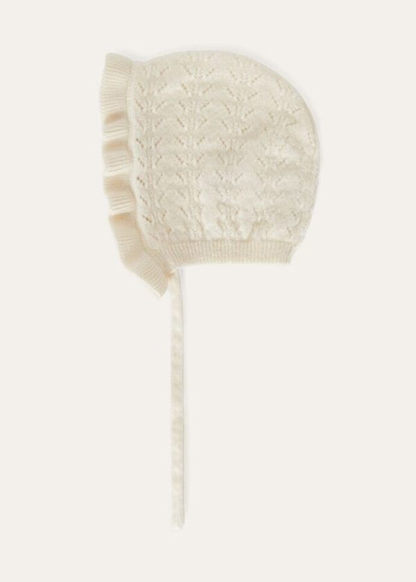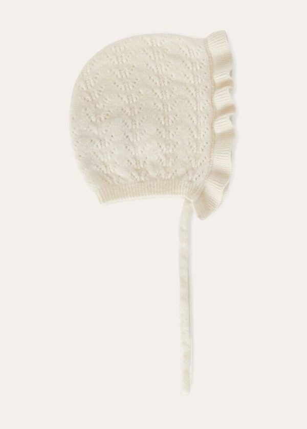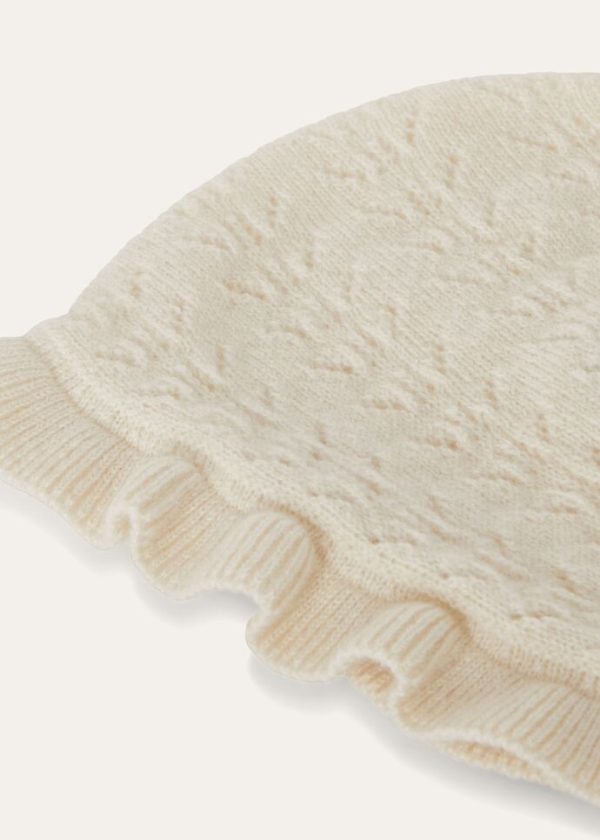 Crafted from a soft, warm cashmere knit, this baby bonnet features a vintage-inspired, perforated pattern. A small ruffle frames the face, adding a delicate, sweet touch of style to baby’s first walks in the open air.