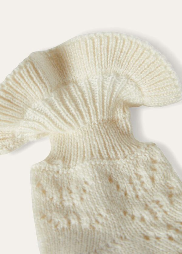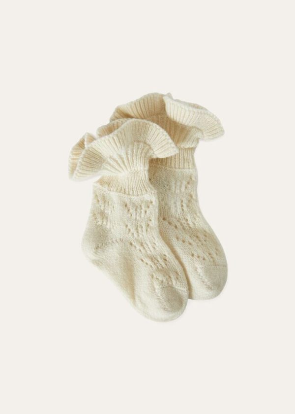 Crafted from soft, warm cashmere yarn, these ankle socks feature a vintage-inspired, perforated pattern. Available in a deep, rich color palette, they are enhanced with a small, rib-knit flounce. An understated, stylish touch that provides any baby with added comfort.