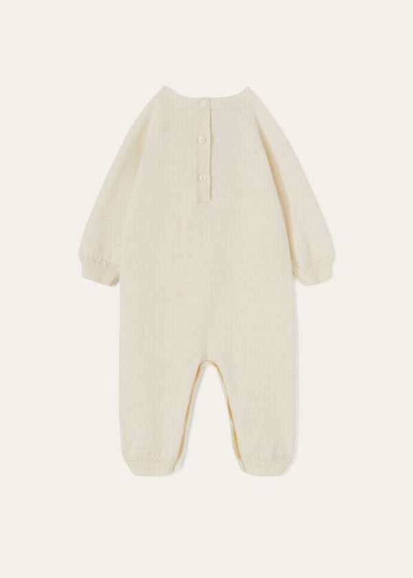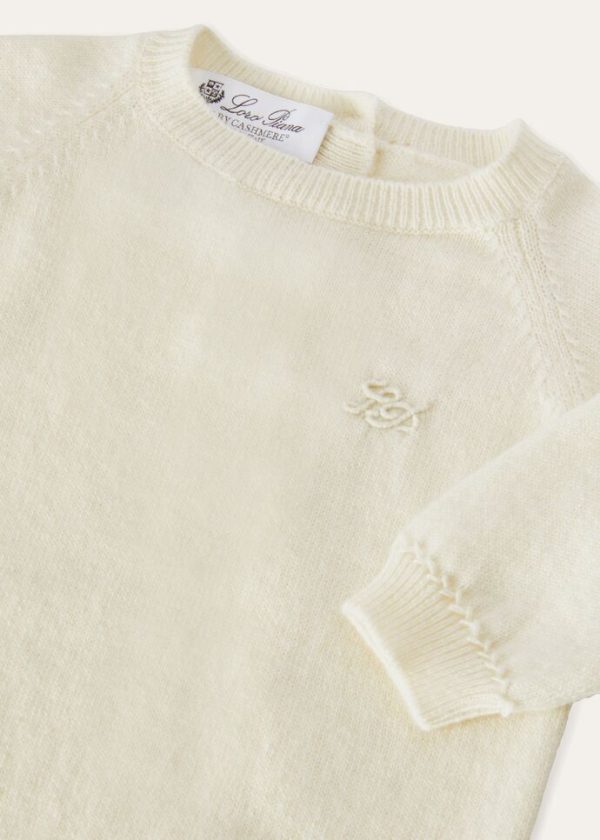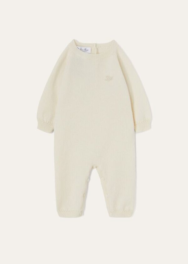 Lightweight, plain-knit infant’s romper made from extremely soft, fluffy baby cashmere. The meticulously selected, luxury yarn embodies Loro Piana’s commitment to sustainability and respect for the environment, which has always been a hallmark of the brand when it comes to the research, development and processing of raw materials. This comfortable style features an embroidered LP monogram on the chest.
