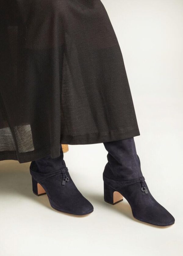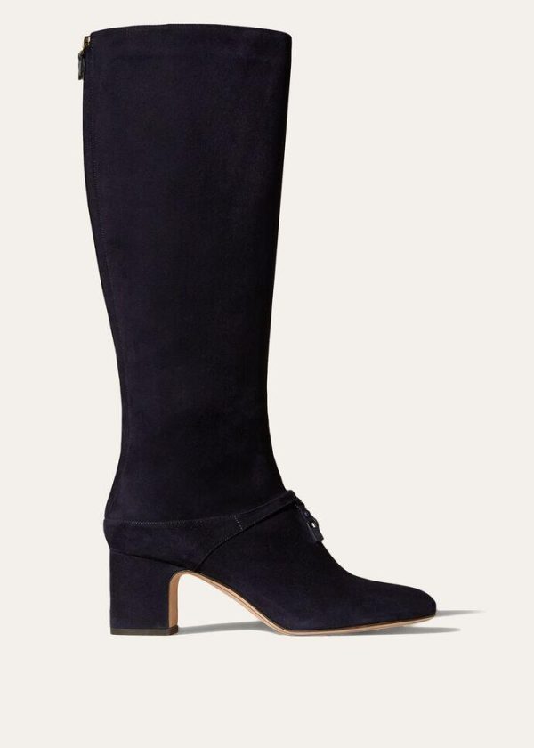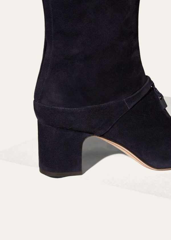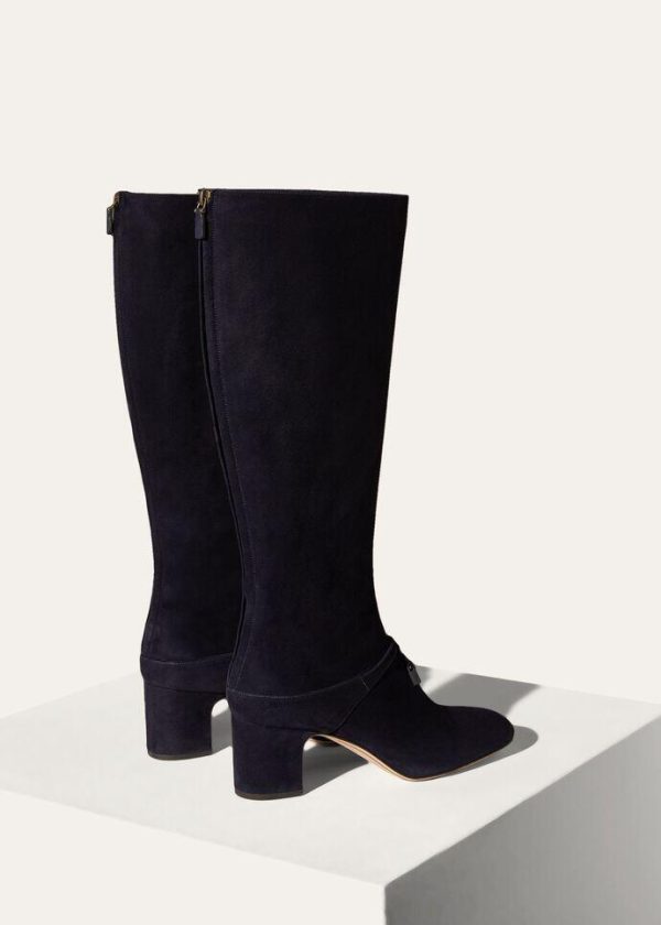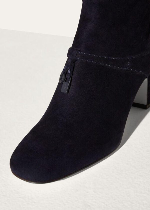 Soft, suede knee-high boots with rounded toes. Their elegant cut is enhanced by a front strap embellished with oversized, iconic My Charms pendants, lacquered in the same colour as the boots. The uppers are shorn during the finishing stages, creating a dense, silky texture, which is enhanced by a light water-repellent, stain-resistant treatment.