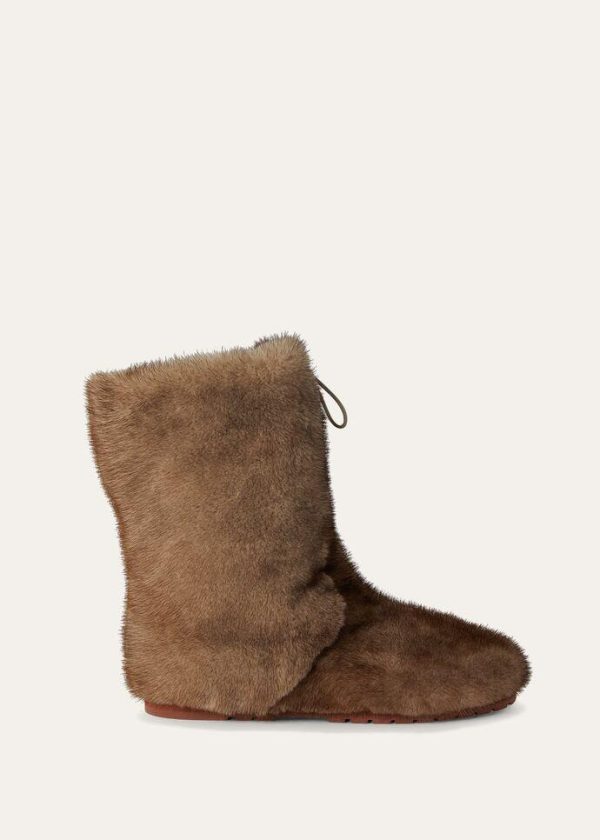 Crafted entirely from long-haired mink, these après-ski, mid-calf boots feature lug soles. The fur is defined by a glossy, full-bodied color, while the lining is in soft cashmere. This lightweight, comfortable style is defined by a distinctive, sophisticated winter look.
