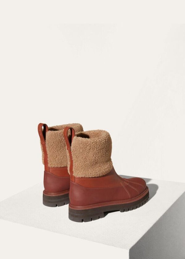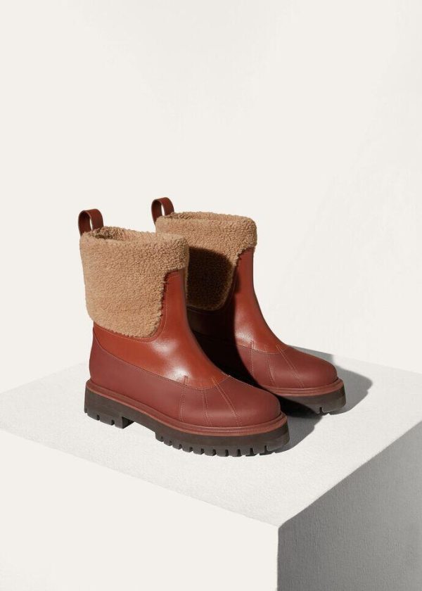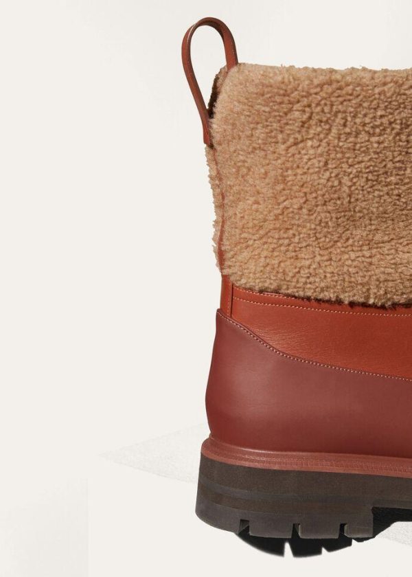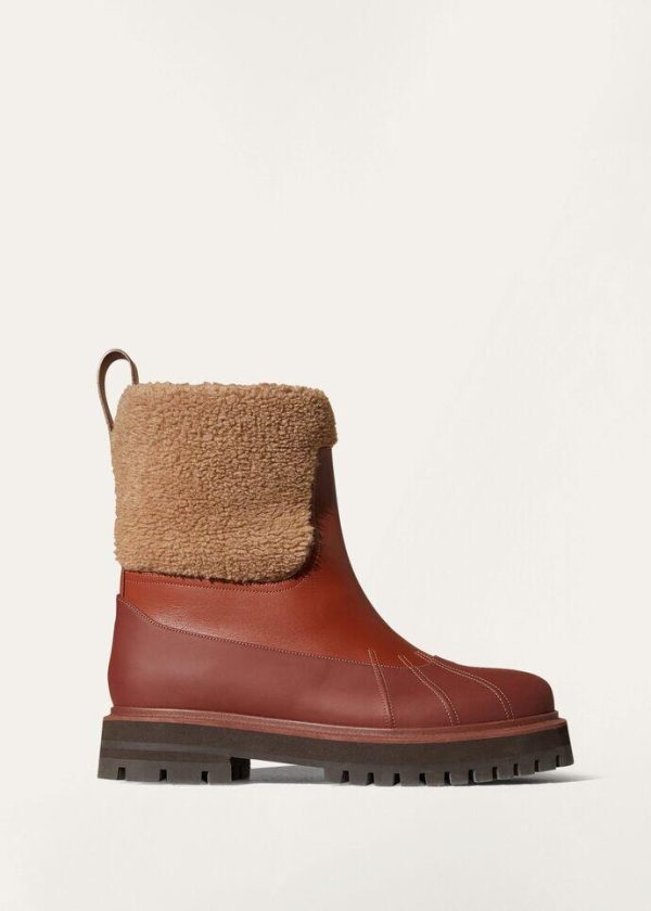 Leather ankle boots, featuring inserts made from Cashfur — an innovative cashmere-and-silk fabric that uses only the softest, most meticulously selected fibers. Inspired by traditional, ankle-high rain boots, they are durable and comfortable, thanks to their thick rubber soles and decorative stitched ribbing at the toes.
