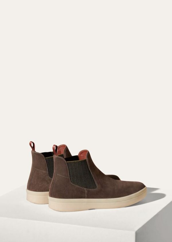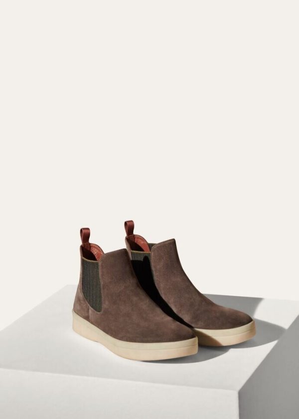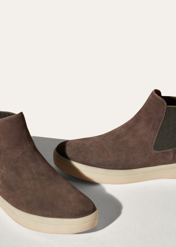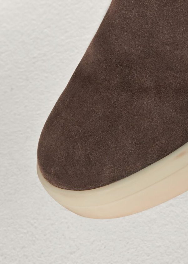 These suede ankle boots are shorn during the finishing stages, creating a dense, silky texture, which is enhanced by a water-repellent, stain-resistant treatment. Their rounded, modern silhouette is completed by knit side inserts featuring a chevron motif and contrasting trim. The soles are crafted utilizing a special technique, making them lightweight and comfortable.
