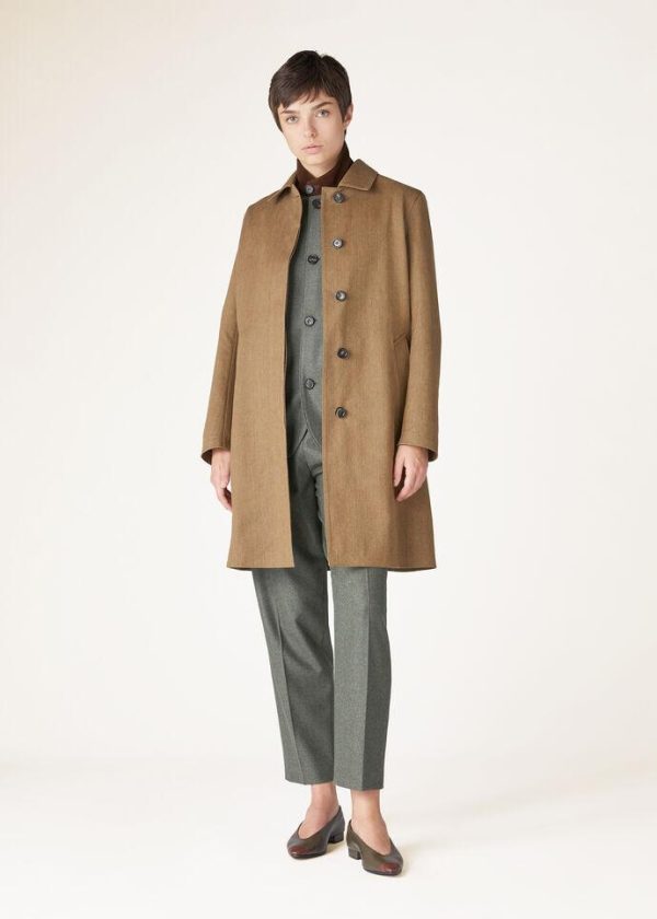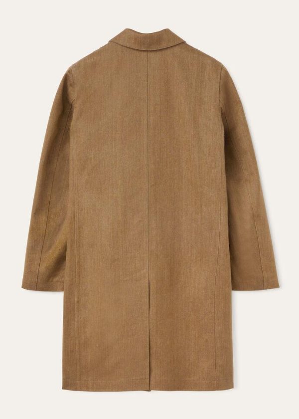 The Alder trench unfolds as a single-breasted coat with a fitted design, showcasing a shirt-style collar and leather lunette. Crafted from a blend of linen and cotton, the fabric is finished for a smooth, lustrous look, while horn buttons at the front add a touch of refined detail. Treated with a water-repellent finish, the trench offers a beautiful mélange of style and functionality, ensuring a versatile statement piece to complement a number of occasions.
