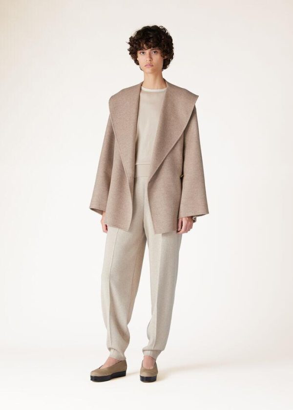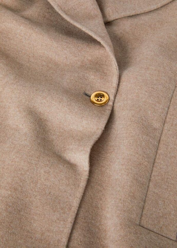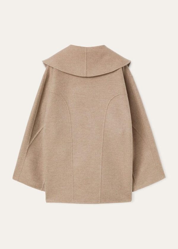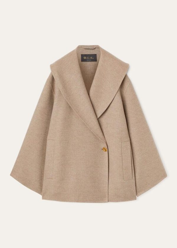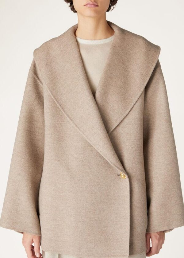A generously cut single-button double-breasted coat, a wonder in double-layer cashmere that offers an exquisitely warm, enveloping embrace. This model has a flared cut and a shawl collar that falls almost to the shoulders, embracing you with its warmth. With slightly dropped shoulders to accentuate the voluminous line, and intricate vertical stitching for additional interest and volume, this sophisticated outerwear option is a testament to comfort and style.