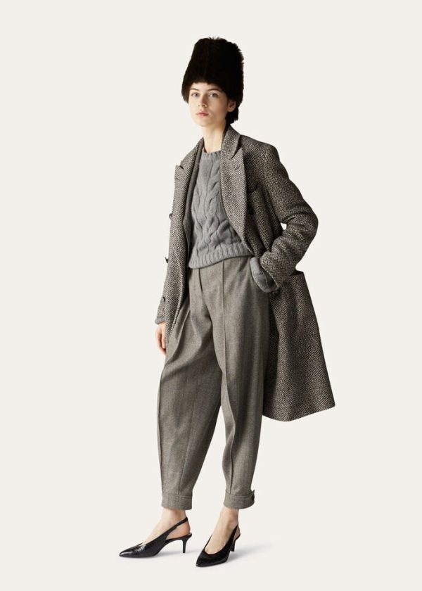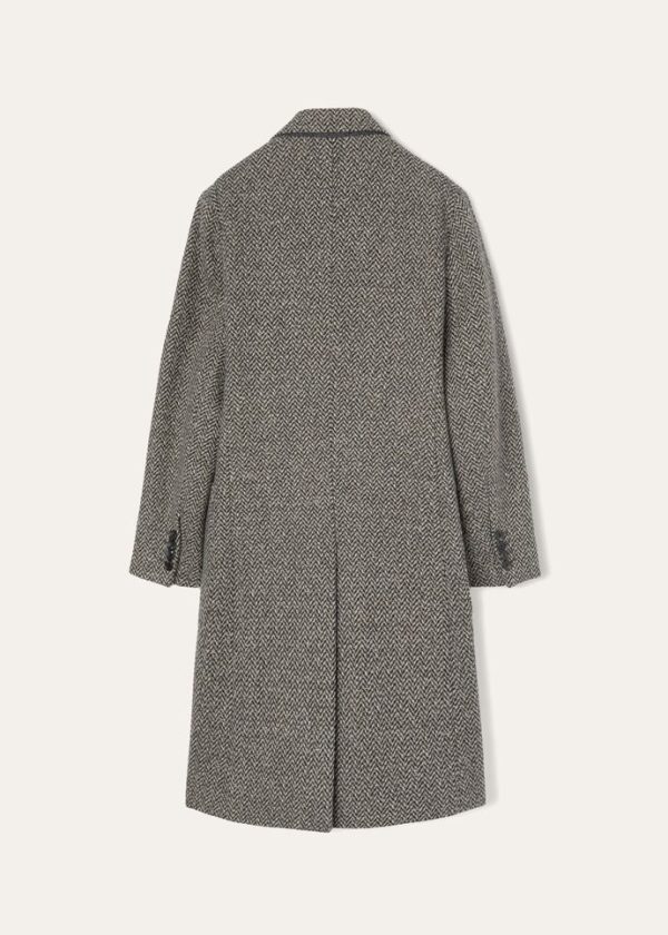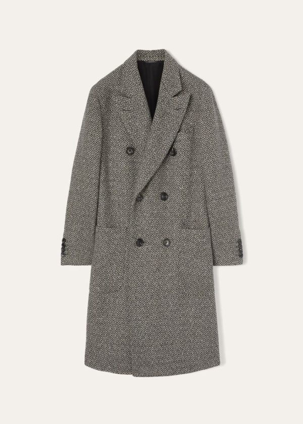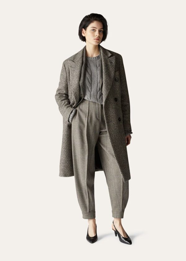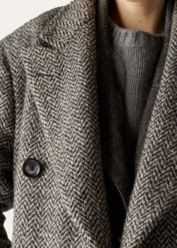 Double-breasted coat made from soft, full-bodied cashmere-and-linen fabric. It is defined by a herringbone pattern and menswear-inspired tailored construction. This vintage-inspired style is brimming with charm and elegance.