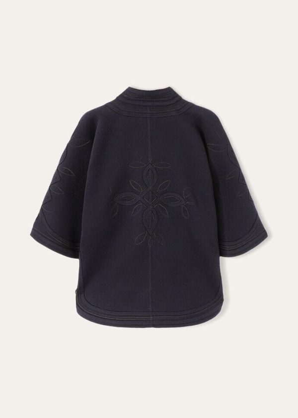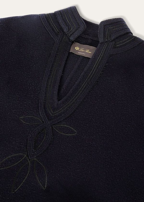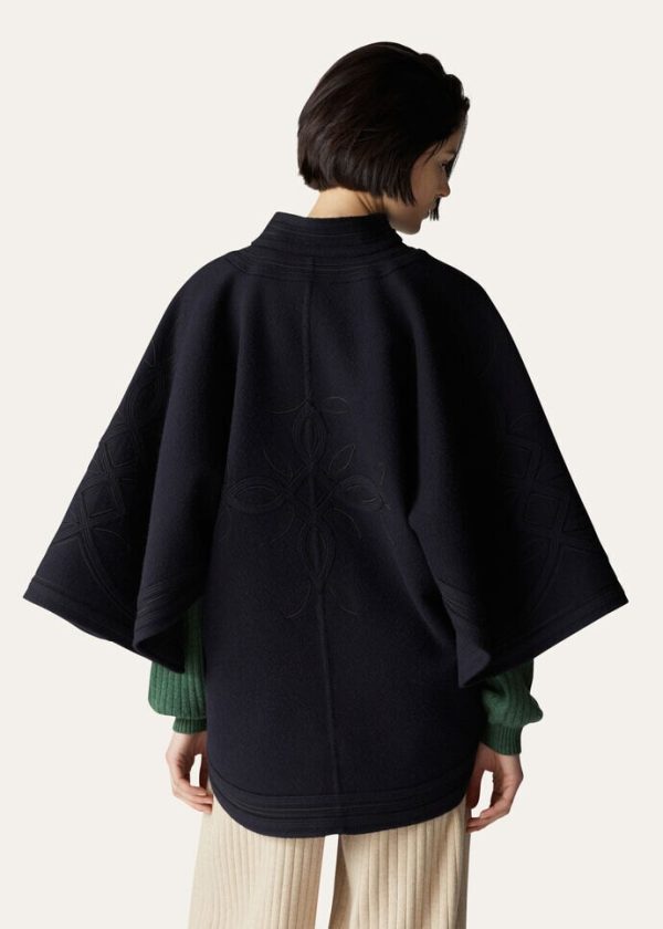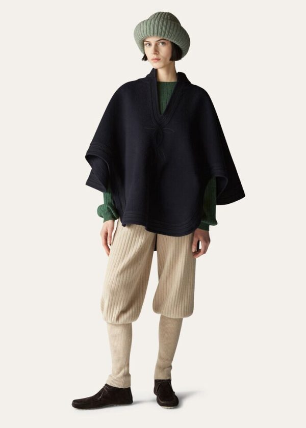 Handcrafted, double-faced cape made from extremely soft, lightweight cashmere. This loose-fitting, full-bodied style features long side openings, invisible seams, and graphical stitched trim along the entire hemline.