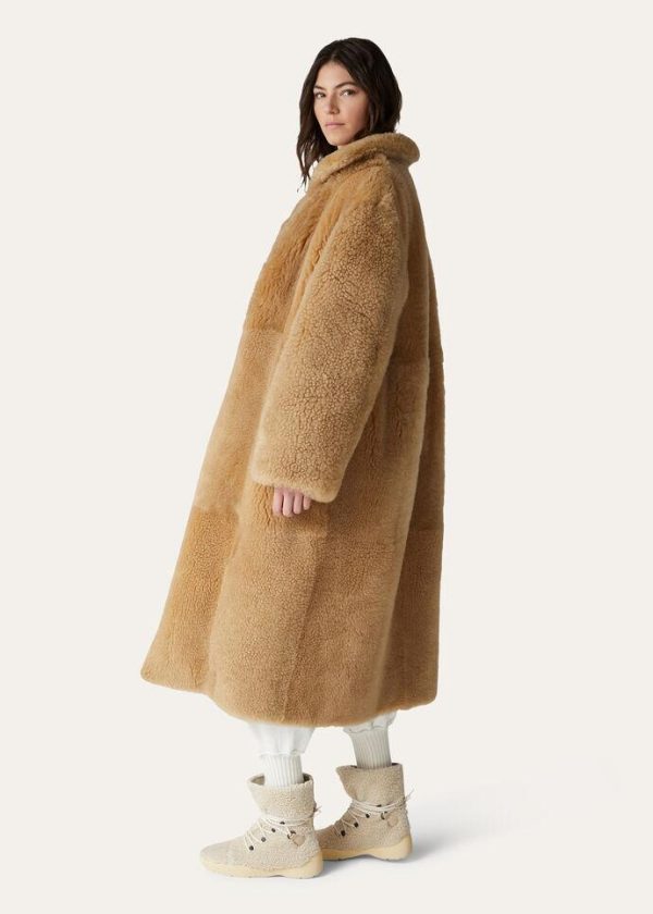 Long coat made from fluffy, gossamer, long-haired shearling that is artisanally crafted to be flowing and lightweight when worn. This padded style features cozy volumes and silk lining with a colorful, feminine floral print.