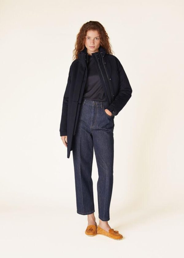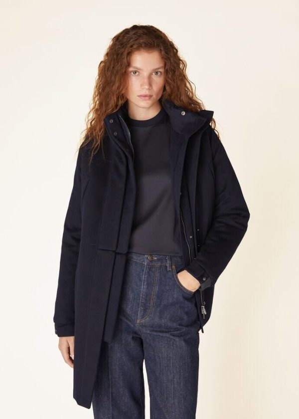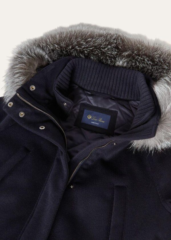 Feminine, mid-thigh length version of the Icer ski jacket, originally created for the 2000 Alpine Skiing World Cup in Bormio. In cashmere treated with Storm System® for a waterproof, wind-resistant finish. Padded in wadding and fox fur trimmed hood. Warm, casual outerwear that is ideal both in the mountains and on cold winter days in the city.