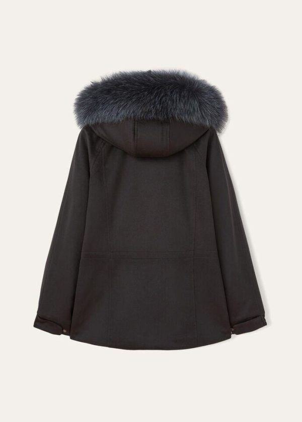 Trim: collar 100% cashmere, hood 100% cashmere, hood edging 100% fox fur