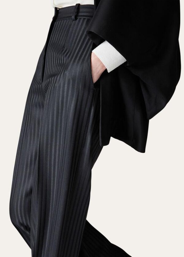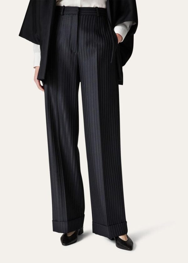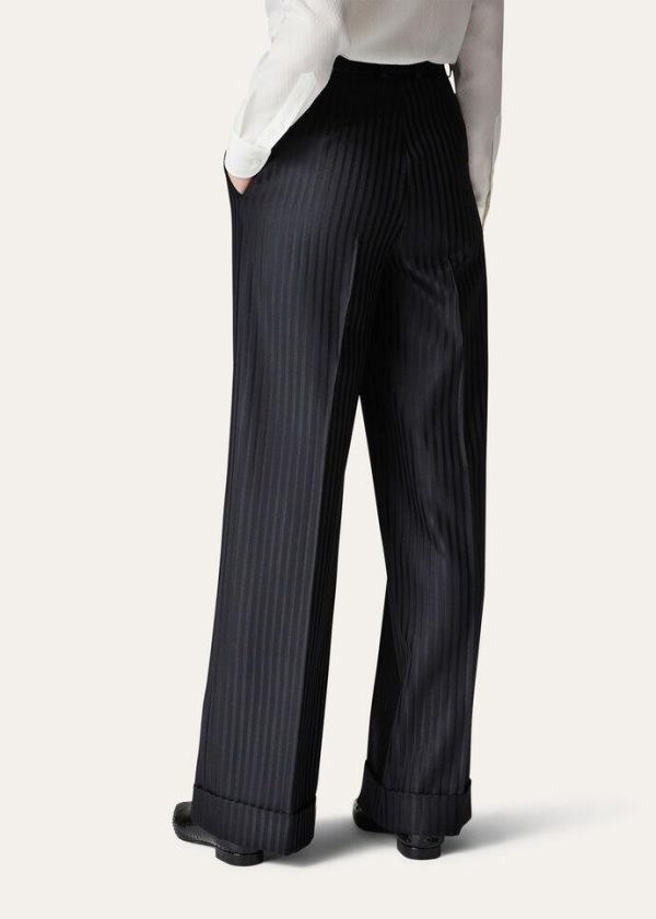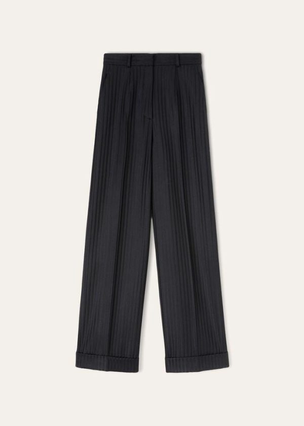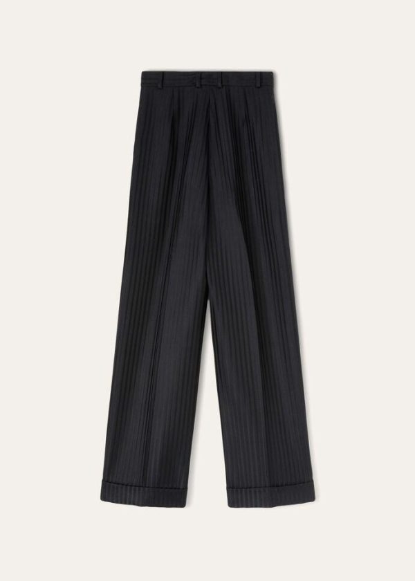 Christmas festivities and events are embodied in the splendor of refined textures and elegant silhouettes. Crafted from lightweight, pure wool fabric, the classic, straight-cut Bibal pants feature a pressed crease and rolled-up cuffs. Their textured jacquard weave creates a subtle play on glossy and matte stripes. A casual-chic style that is perfect when worn with structured outerwear in formal looks.