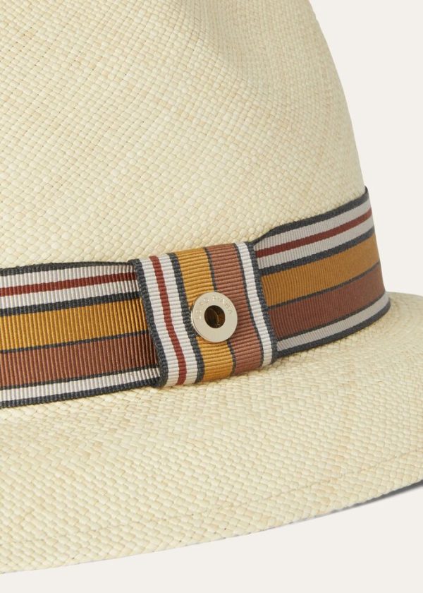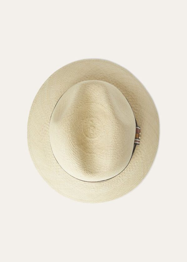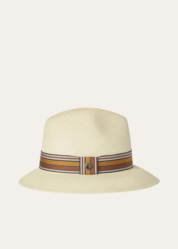 Classic Panama hat crafted from straw plaited by hand in Equador. It features a silk grosgrain band with a multistripe pattern in brown, red and yellow. Perfect on summer days, from beach to street, to complement refined casual outfits.