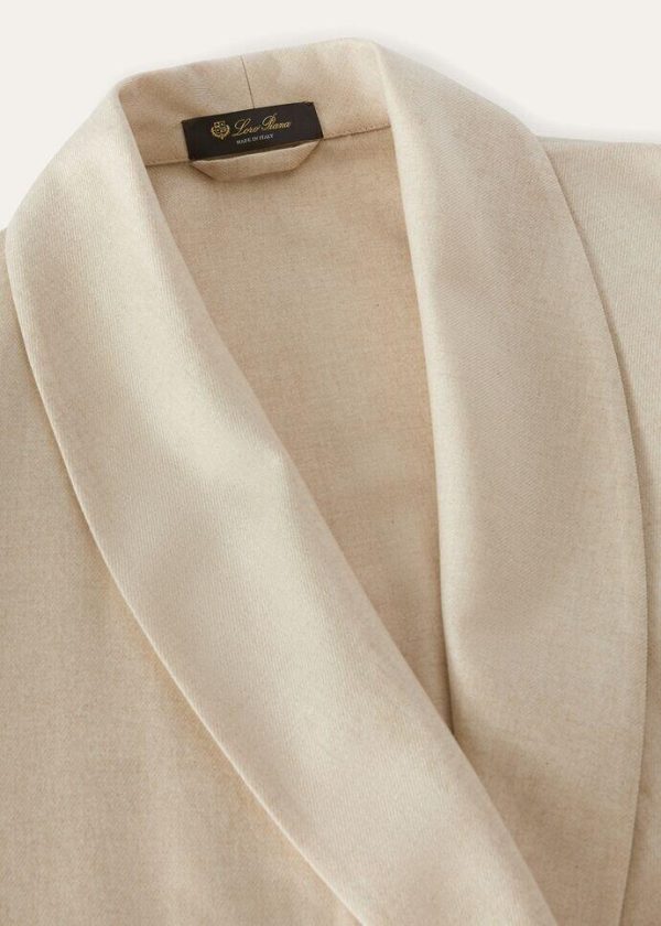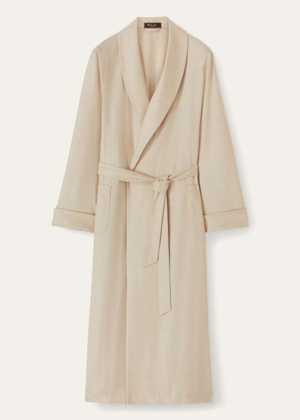 Flannel robe made from lightweight cashmere, which is naturally soft and comfortable against the skin. It features classic lapels, patch pockets and a matching belt at the waistline.