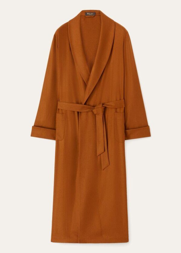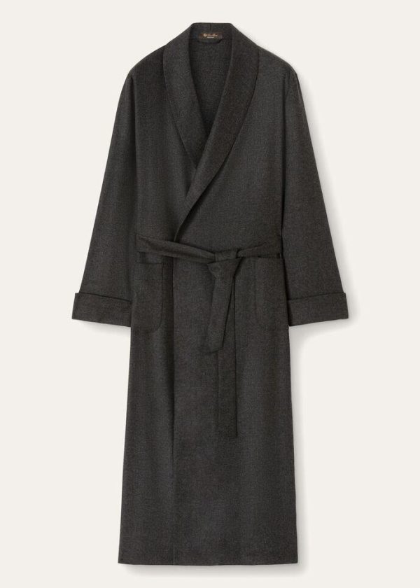 Flannel robe made from lightweight cashmere, which is naturally soft and comfortable against the skin. It features classic lapels, patch pockets and a matching belt at the waistline.