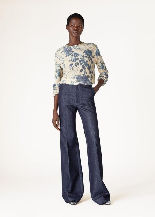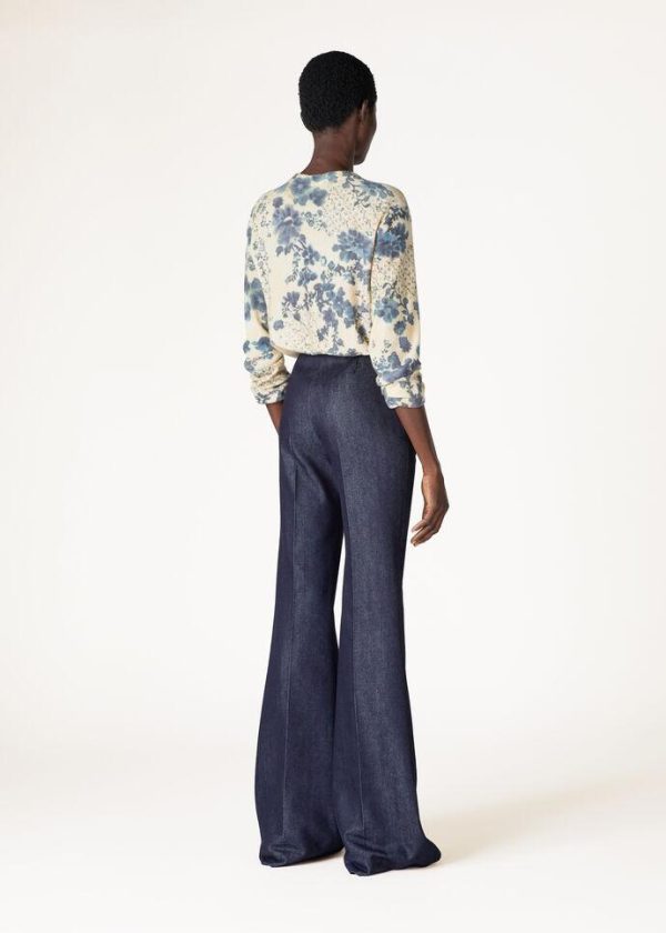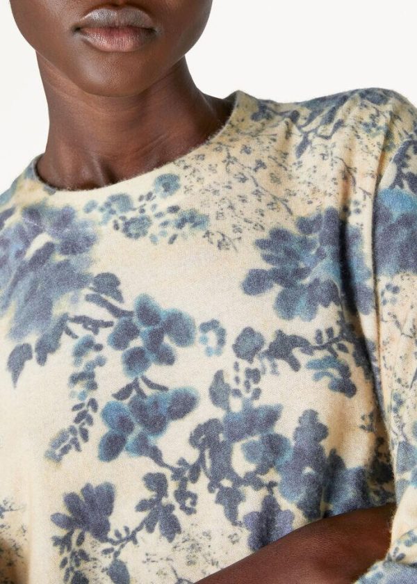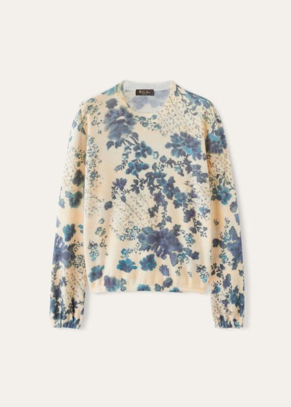 Crafted from cashmere, the Blue Eyes sweater features a Japanese-inspired floral print in calming shades of blue, adding an artistic note to the design. The exquisitely soft hand, achieved through the use of airy lightweight yarn, makes this piece a luxurious indulgence in comfort and a timeless expression of elegance. Embrace the serenity of Japanese esthetics with this beautifully crafted crewneck sweater.