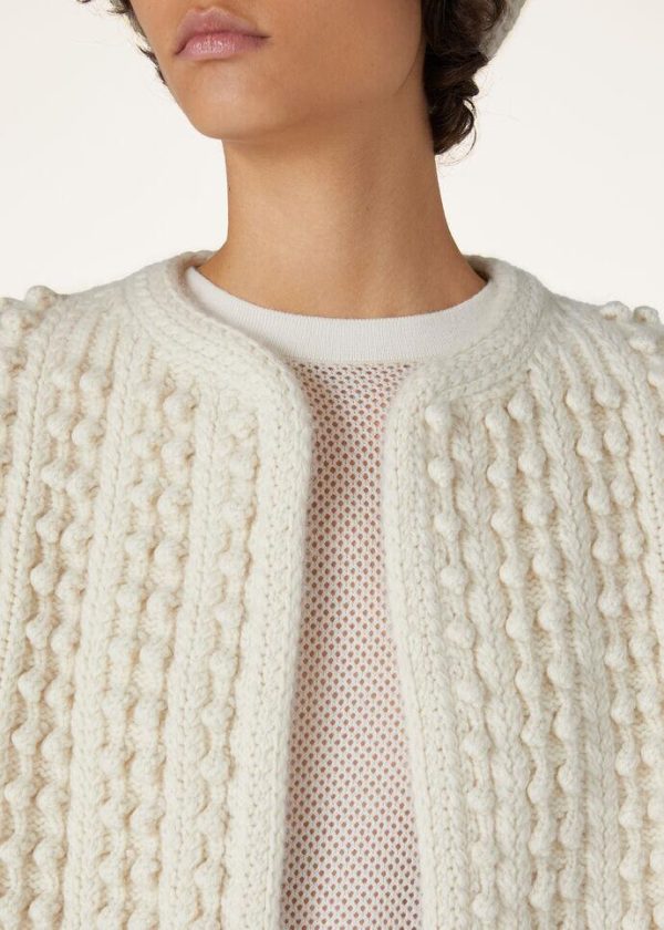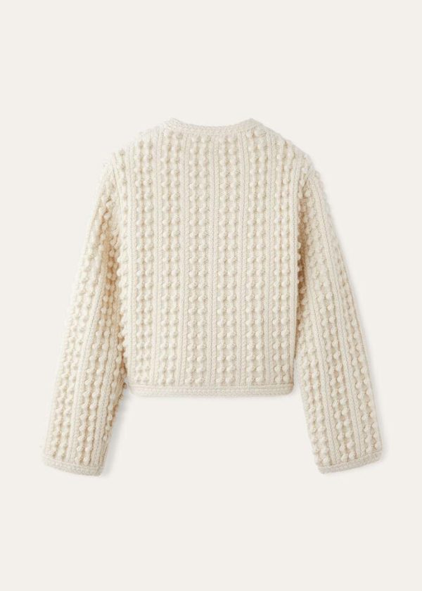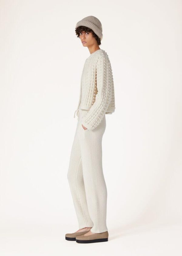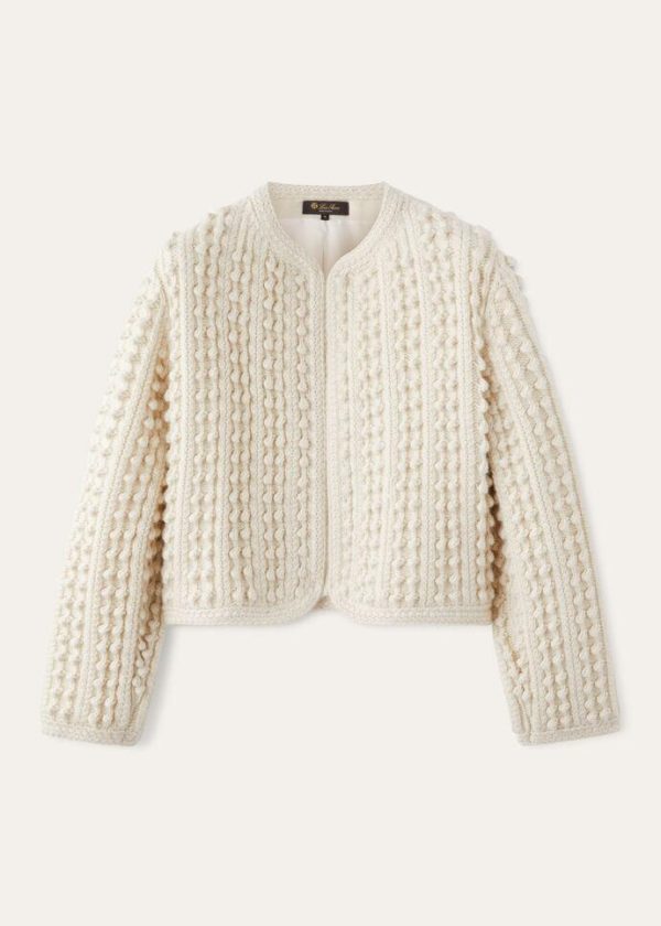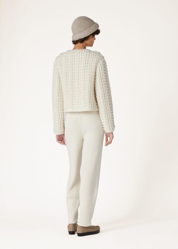 Jacket in Baby Cashmere Coarsehair® – a yarn known for its full texture, perfect for three-dimensional stitches that play with light and shadow. The undyed version celebrates the natural softness and comfort of this luxurious fiber. The jacket features an intricate puff stitch that adds depth and texture. With a straight cut, waist length and almost boxy shape, it effortlessly combines style and comfort.
