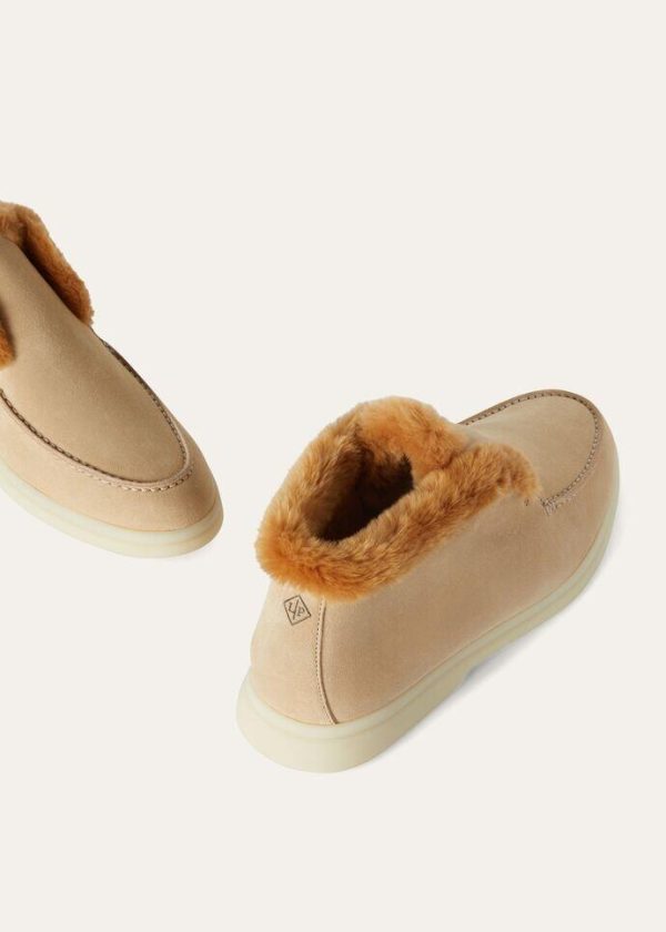 Classic suede chukka boots with a light water-repellent, stain-resistant treatment. Inspired by Loro Piana men’s footwear, they feature beaver-fur lining and a patented opening with elastic hidden under the tongue. This warm, comfortable style is perfect in the city or the mountains on the coldest days of the year.