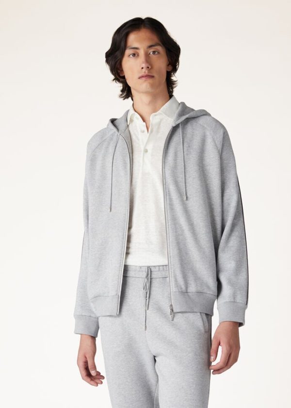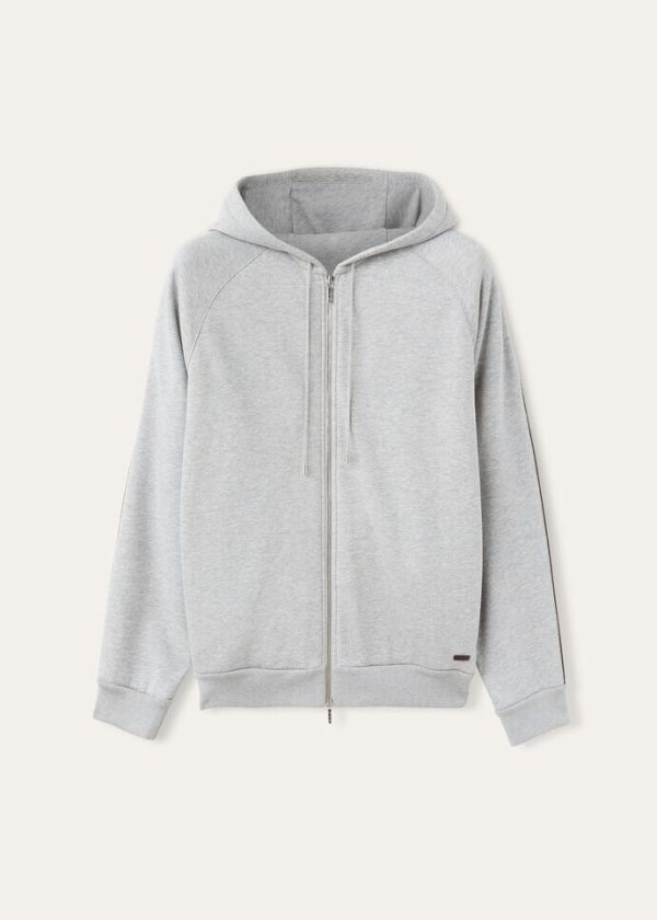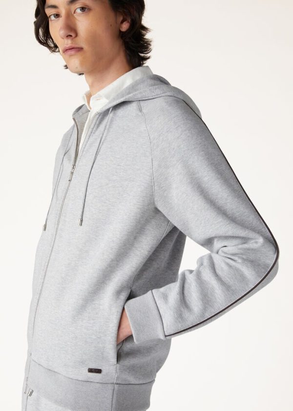 Embark on a journey of dynamic Japanese-inspired style with the Asago hooded bomber, soaring in cotton and cashmere jersey. Its soft, fleecy feel against the skin is complemented by leather piping along the sleeves and side pockets. Cut to a regular fit, this versatile piece becomes a multi-tasking layer that captures the essence of comfort and contemporary elegance.