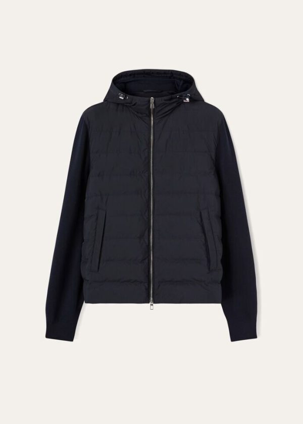 Hooded puffer jacket made from lightweight Wind Stretch microfiber. Thanks to a special Storm System® treatment, they are water-repellent and windproof. Sophisticated Wish® wool details on the sleeves create a multi-layered look for a decidedly sporty allure.