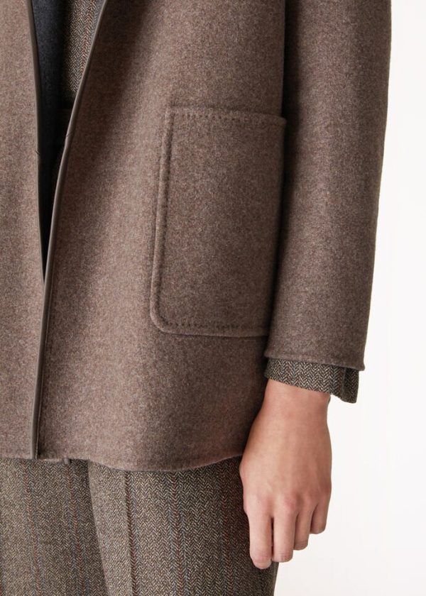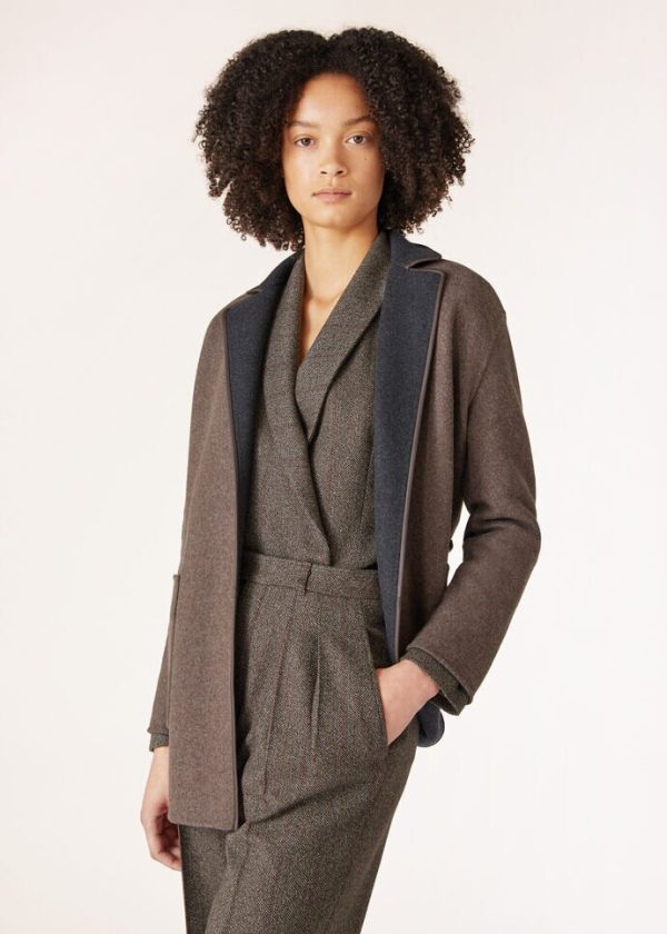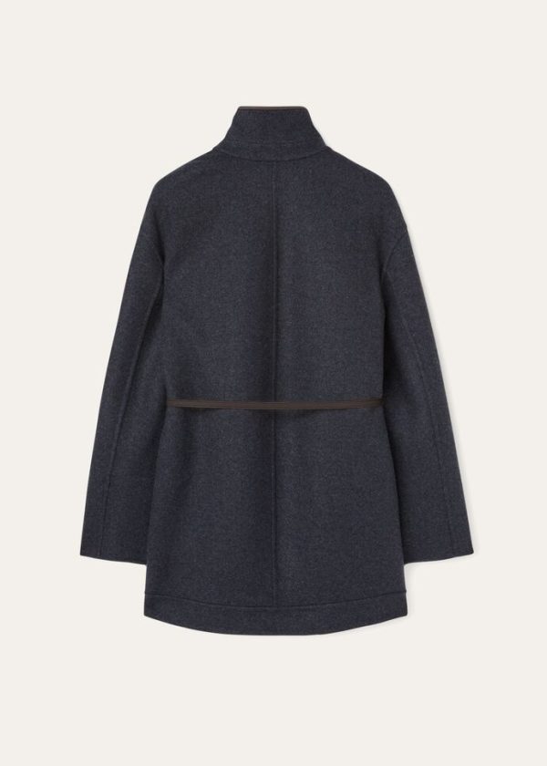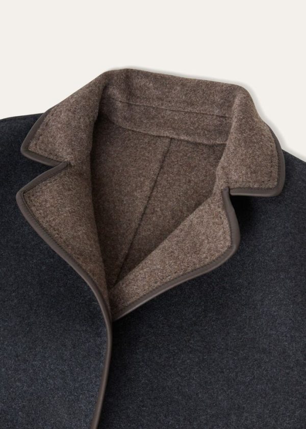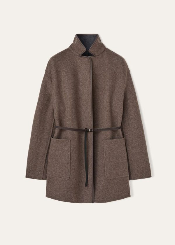 Reversible jacket crafted from super-soft two-tone double baby cashmere jersey. The plongé leather belt fastens the jacket and adapts the line of the waist as desired. It can also be worn open to create distinctive layered looks, showing the different coloured sides.