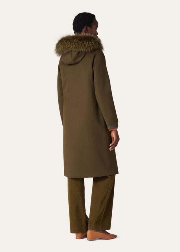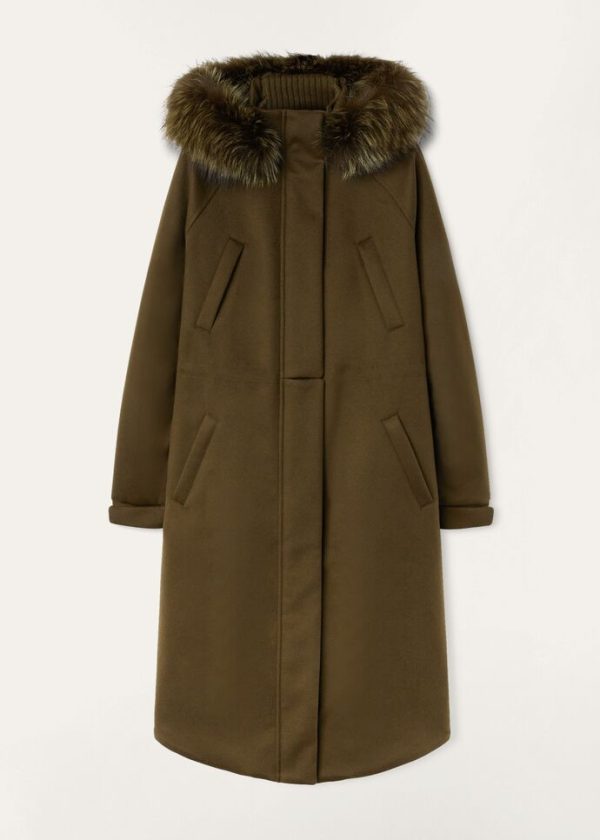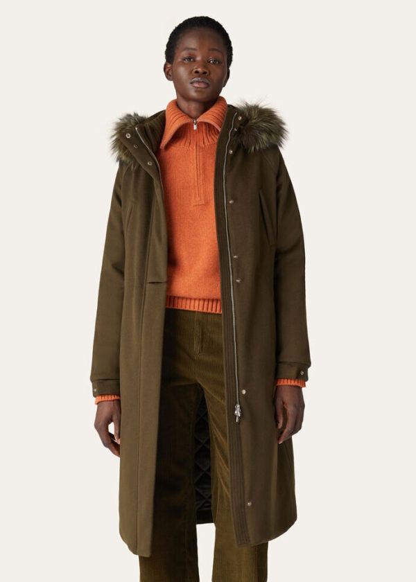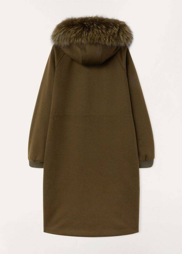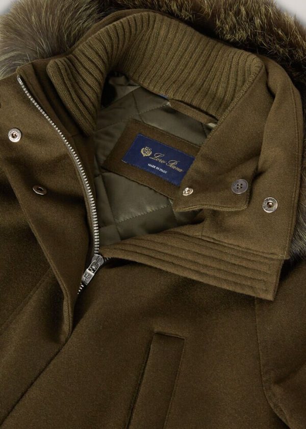 Jacket in cashmere with hood edged in fox fur. Treated with Storm System® for waterproof, wind-resistant protection. Very warm and comfortable, it is ideal for cold winter days in the mountains, or in the city.