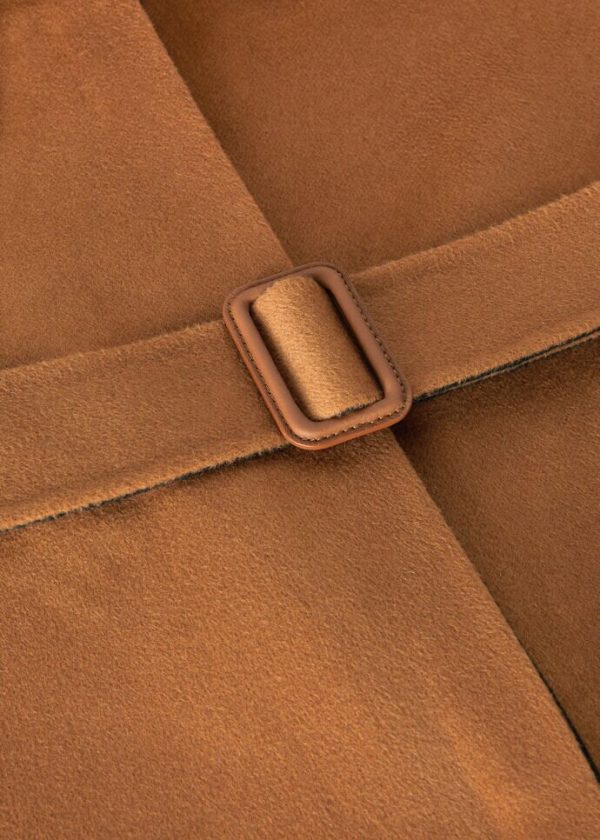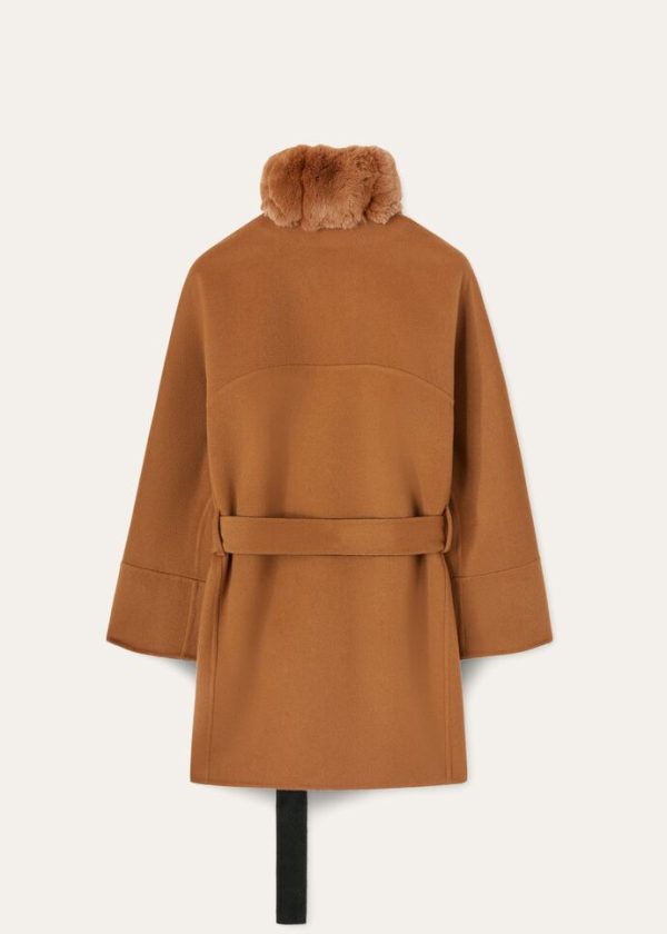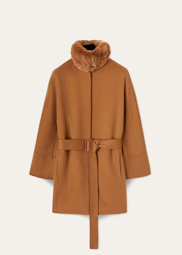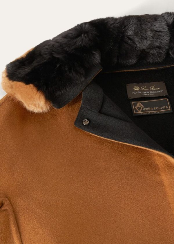 Crew-neck peacoat. This double-faced style features one side in baby cashmere, and the other in luxury vicuña. The combination of soft, warm fibers is perfect for winter, while a detachable chinchilla collar provides a sophisticated flair. It is defined by a mid-thigh length and hidden button closure, along with a belt and leather buckle that accentuates the waistline.