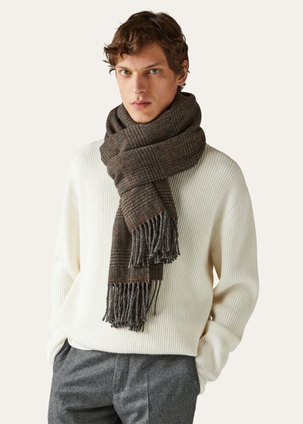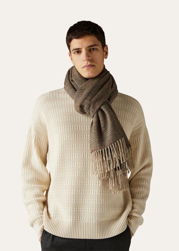 For the Autumn/Winter season, Loro Piana offers a new version of the iconic Grande Scarf. Crafted from fluffy cashmere, it features a pattern taken from Loro Piana’s historic archives; the result is a multi-colored, herringbone weave with a three-dimensional look. Solid-colored and mélange inserts create delicate, masculine pinstripes.