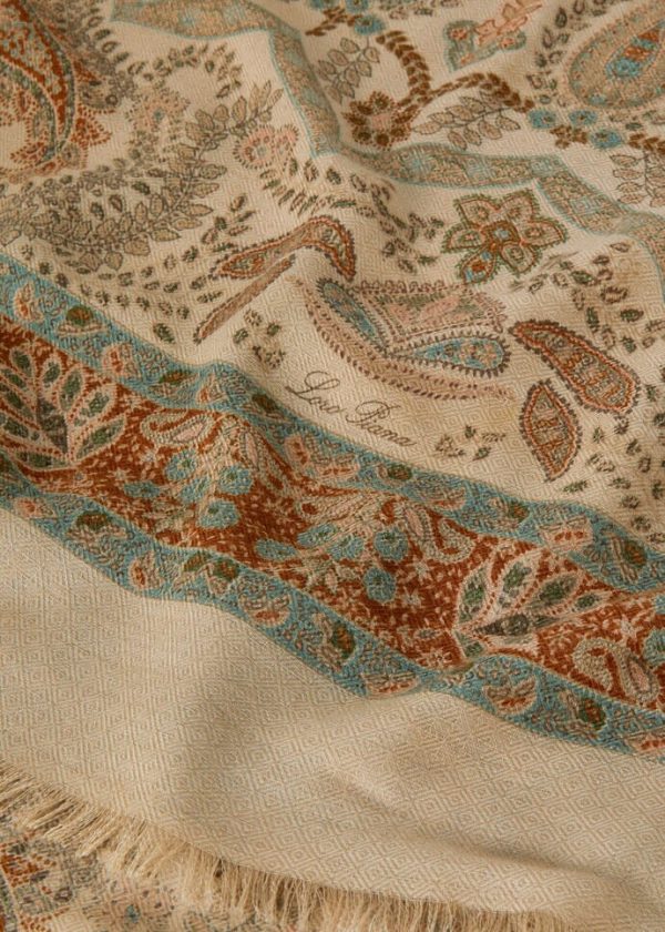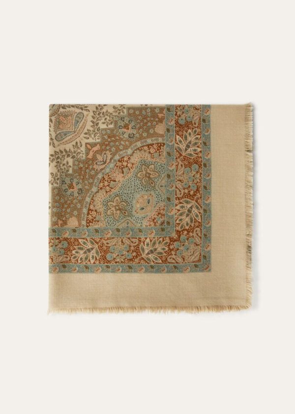Journey through the ever-changing tapestry of nature with our rich shawl, which gracefully captures the poetic essence of the Japanese-inspired collection. Crafted from cashmere and silk, it features a beautifully decorative print from our archives at the center, framed by a plain border. The cashmere provides warmth, while the lightweight silk adds luster to the colors, adding a touch of signature sophistication to your ensemble.