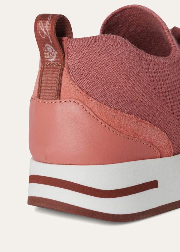 The upper is crafted on a knitting loom then assembled onto the sole in ultra-light technical material with a bagged construction
