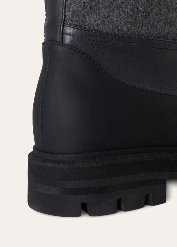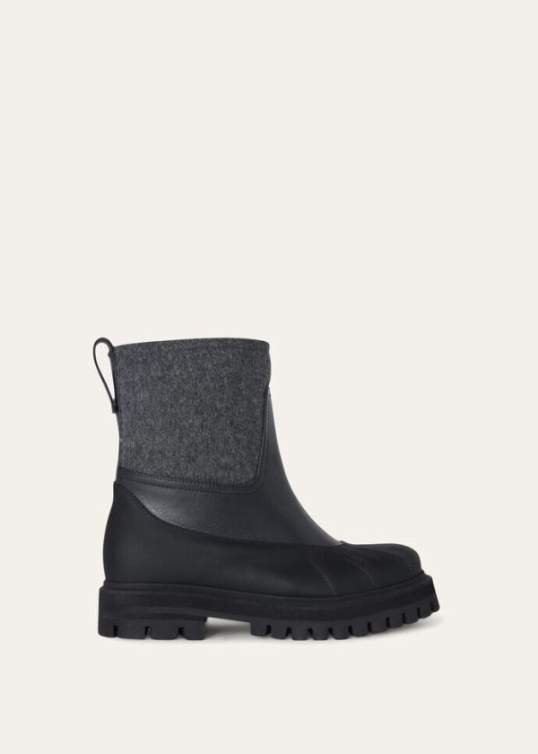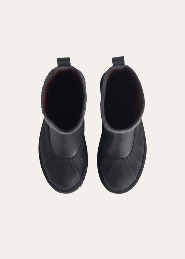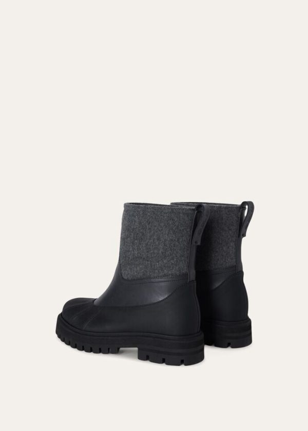 Ankle boots made from cashmere fabric. Thanks to a special Storm System® treatment, they are waterproof and wind-resistant. Inspired by traditional, ankle-high rain boots, they are durable and comfortable, thanks to their thick rubber soles and decorative stitched ribbing at the toes.