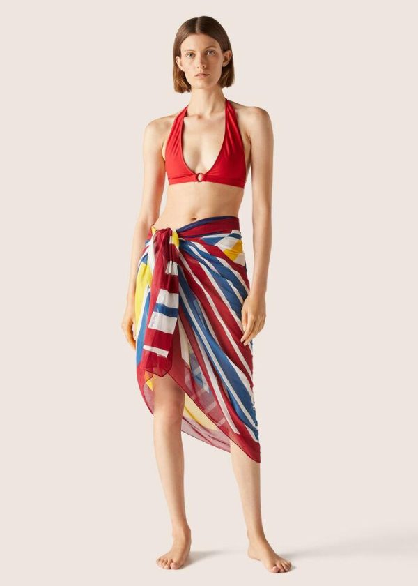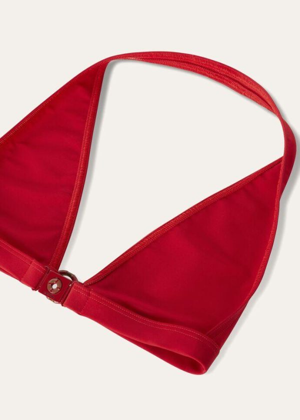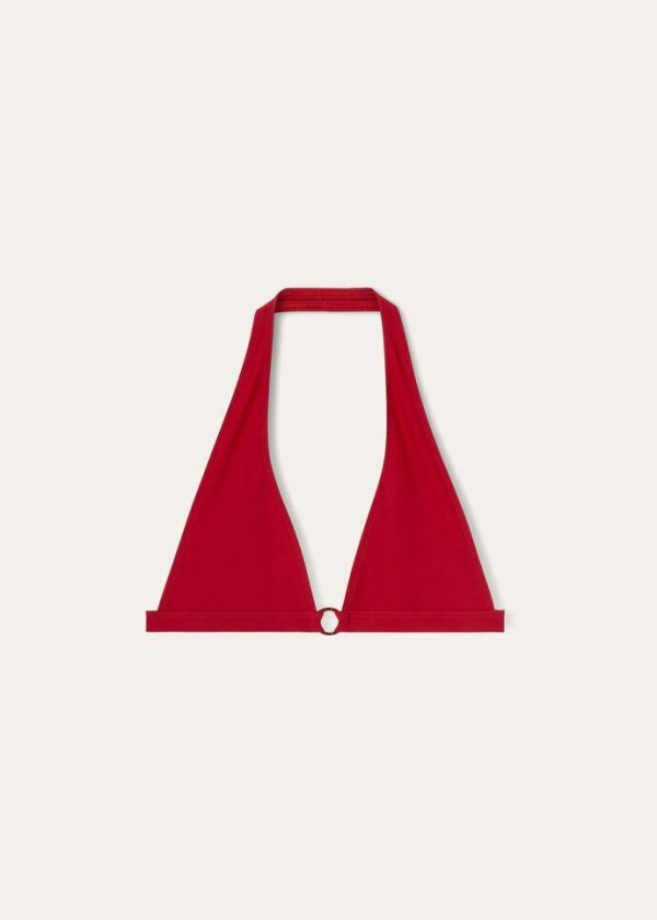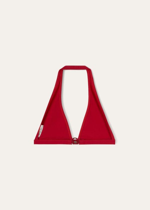 Triangle bikini made from microfiber jersey. The compact, high-performance fabric is durable and resistant; it perfectly clings to the body, guaranteeing a comfortable fit. It features a halter neck with no fastening and an enameled-metal eyelet in the shape of a life preserver—one of the collection’s main themes.