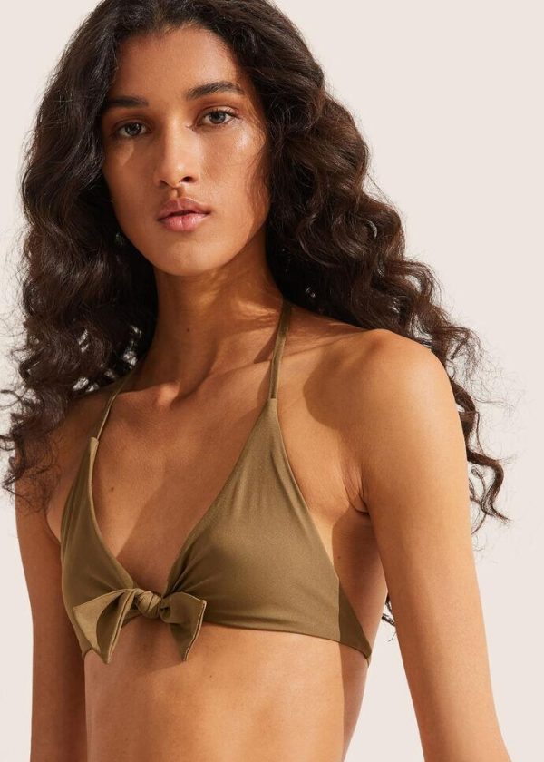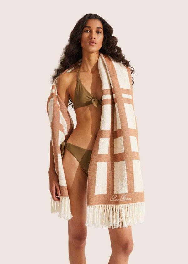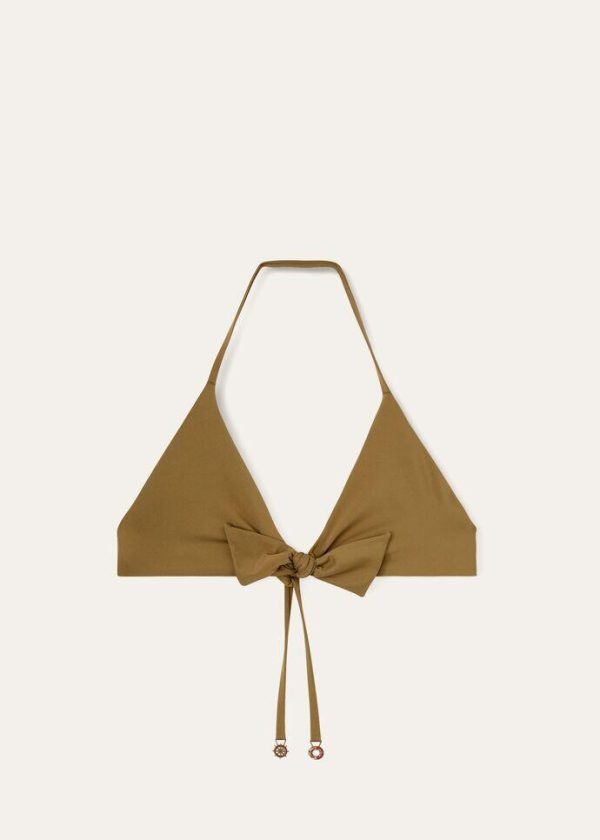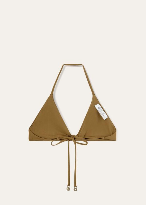 The swimsuits of Loro Piana’s Spring/Summer collection evoke the laidback life of islands surrounded by far-away waters. Crafted from soft jersey, this bikini top is defined by bright colors and a compact texture that is both lightweight and durable. When worn with matching bikini bottoms, it creates an extremely feminine swimsuit. A front knotted bow and thin laces with nautical-inspired charms that tie at the back complete the look.