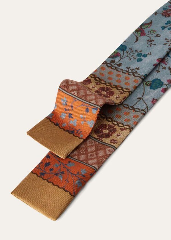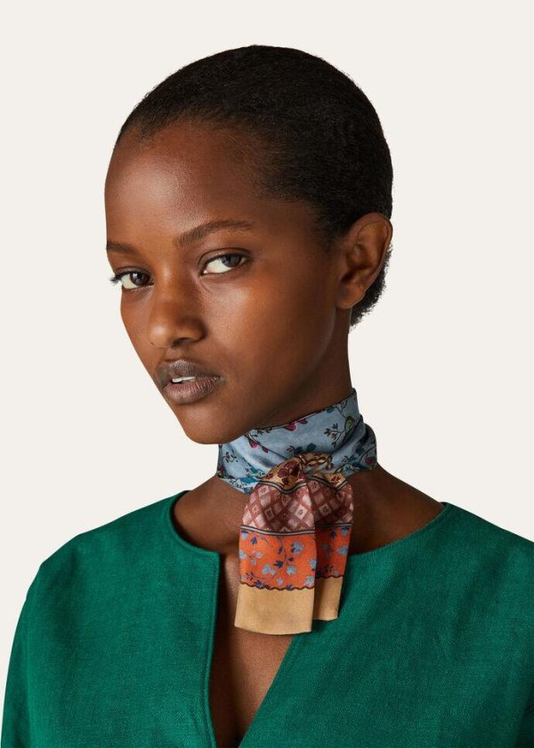 This Loro Piana neck scarf features a multi-colored floral motif, evoking the allure of ancient Andean cultures. Crafted from silk twill, it is defined by a sumptuous, sophisticated, highly colorful patchwork design with patterned trim. A one-of-a-kind luxury accessory that can be braided in the hair or knotted like a tie.
