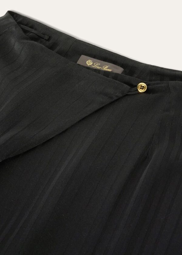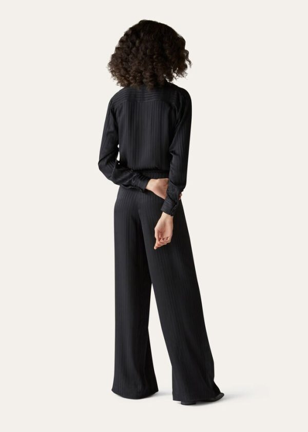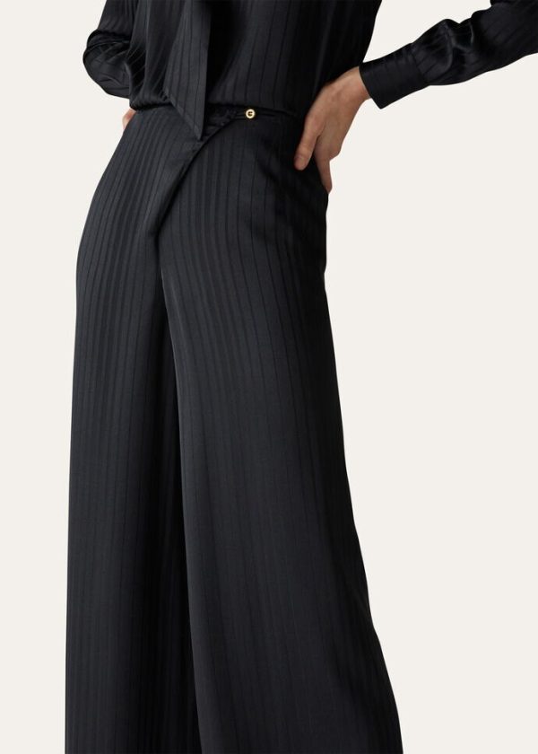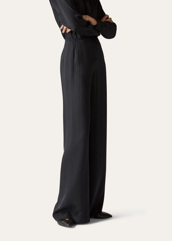 The quiet, natural elegance of the immense New Zealand landscape is embodied in a collection featuring enveloping, flowing silhouettes and a tailored allure. Crafted from pure silk, the wide-legged Dresden pants are defined by a jacquard weave emblazoned with faded vertical stripes, creating a sophisticated play on bright and opaque color. A versatile, comfortable style that is perfect in casual-chic looks.