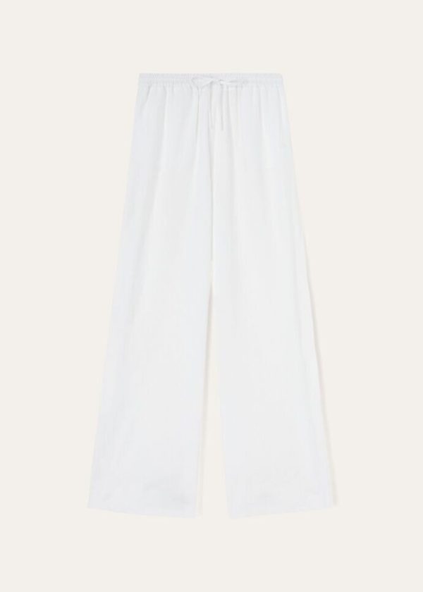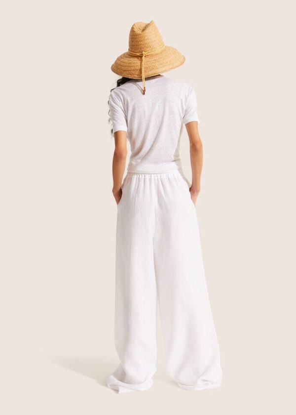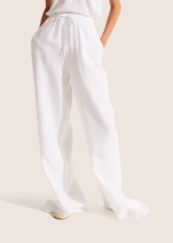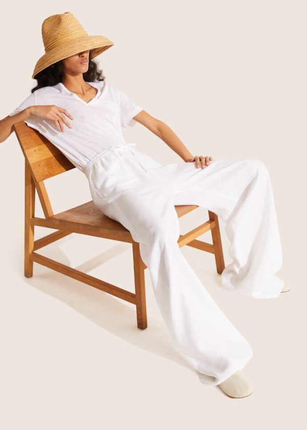 Inspired by lazy days spent lounging on faraway beaches, these relaxed, wide-legged Loro Piana pants are defined by a natural linen fabric weave. The material is treated with a soft aloe finish that resists wrinkles, while providing a flowing drape. A comfortable, loose-fitting style featuring an elastic drawstring waist that is perfect for summertime lounging.