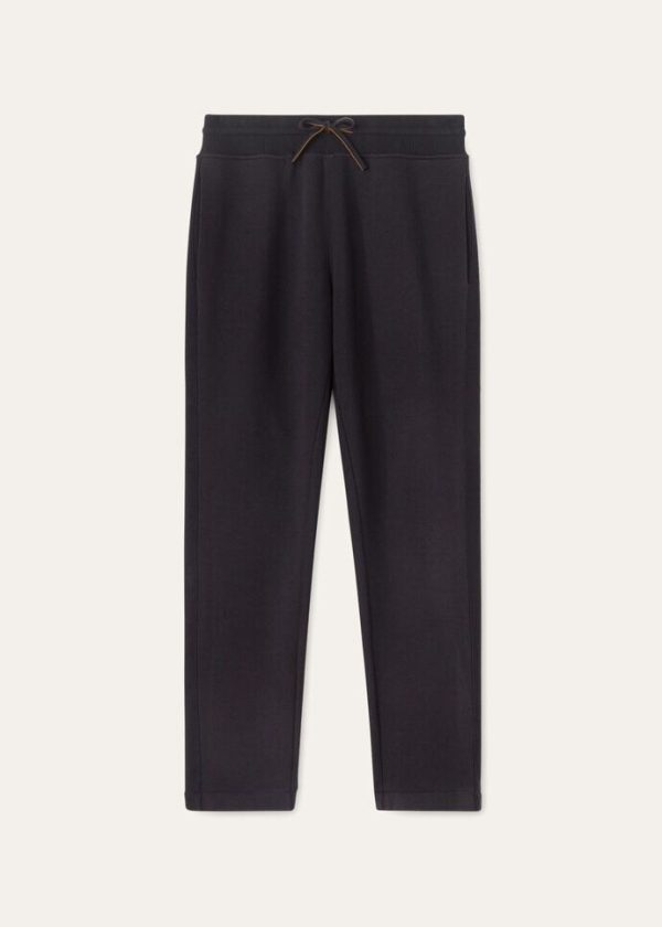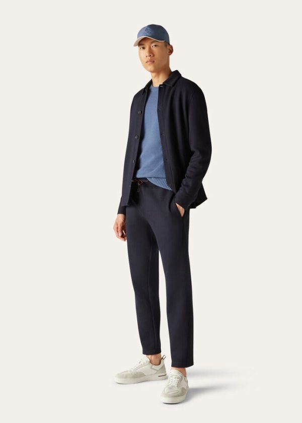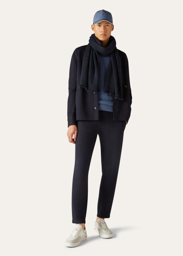 Double-jersey joggers made from cotton and cashmere. They feature a rib-knit, drawstring waistband and decorative, solid-colored knit side stripe. The soft, warm yarns are enhanced by a pure silk jersey interior, providing Loro Piana’s hallmark lightweight, comfortable fit.