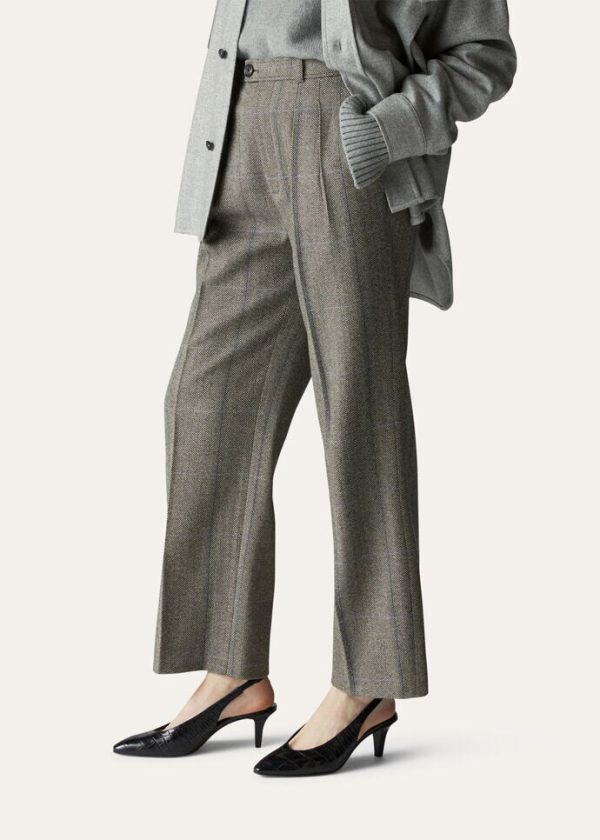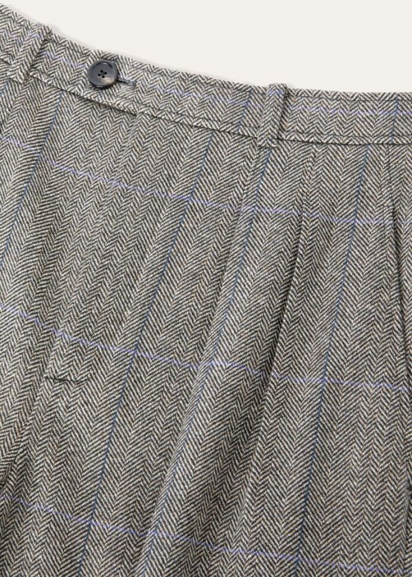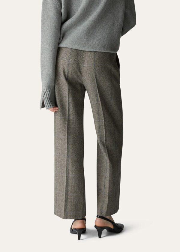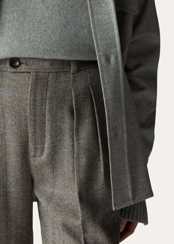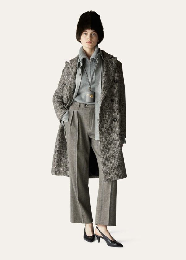 The quiet, natural elegance of the immense New Zealand landscape is embodied in a collection featuring enveloping, flowing silhouettes and a tailored allure. The cashmere Yurik wide-legged pants are defined by a fluffy, three-dimensional look. Their overcheck herringbone pattern is taken from Loro Piana’s historic archives. Double darts at the waist complete this flowing look. A versatile, sporty style that is perfect in daily wear.