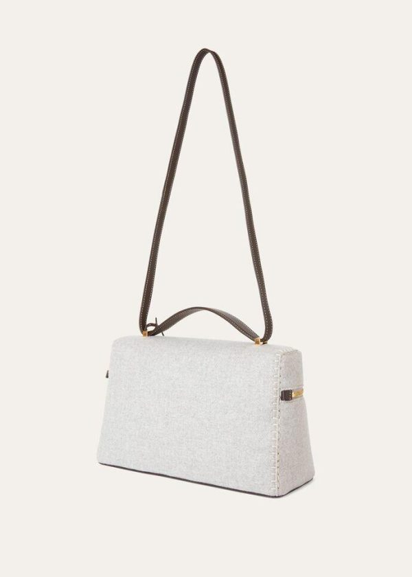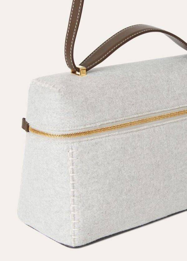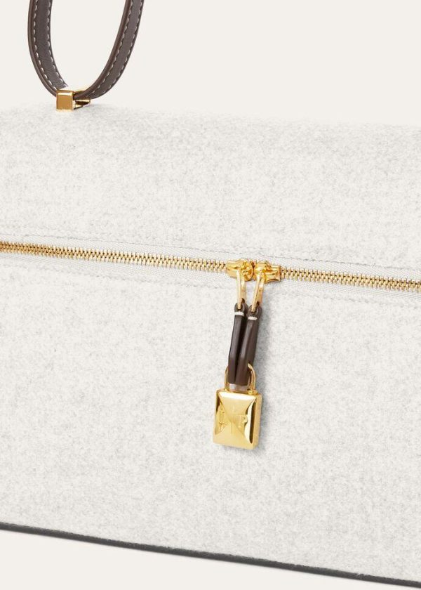 This new entry in the Extra line is defined by sophisticated elegance and an elongated, geometric design. Inspired by charming vintage suitcases, it features meticulously selected details, topstitched trim and modern, clean lines. It is crafted from mélange felted cashmere treated with a unique finish, creating a soft, compact texture and lightly water-resistant surface. The calfskin details are exceptionally soft, thanks to meticulously selected materials and exclusive techniques used for tanning, dyeing and finishing, evoking the glove-making tradition. New lock charms bestow the perfect elegant, feminine finishing touch.
