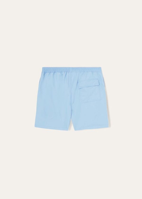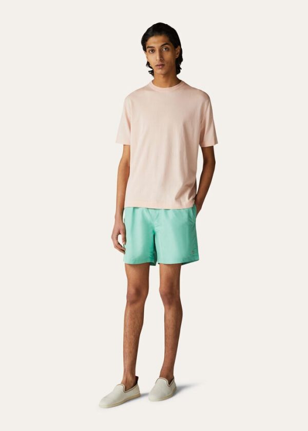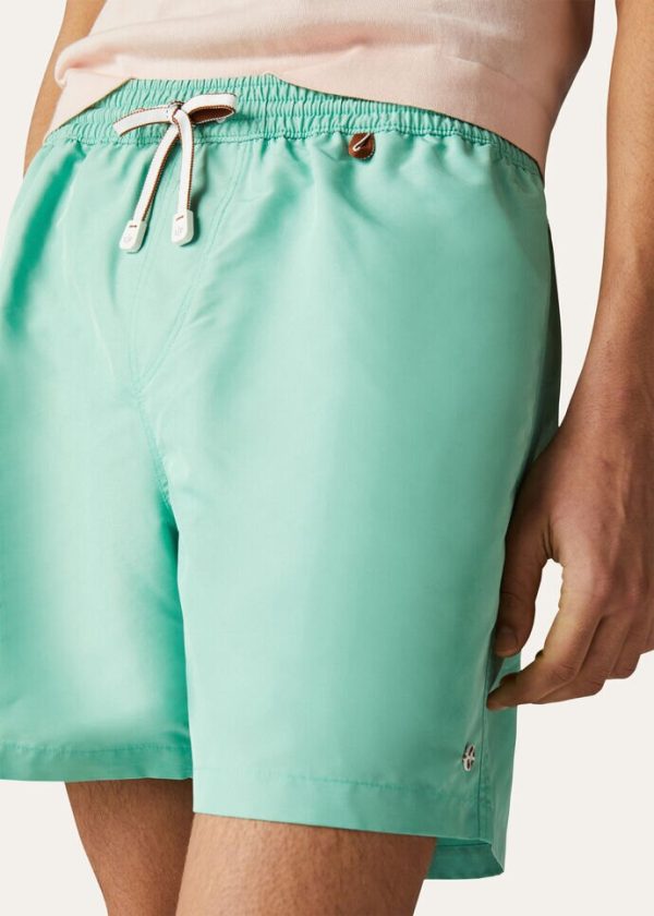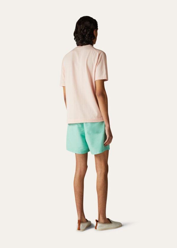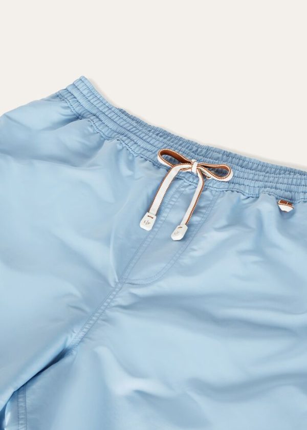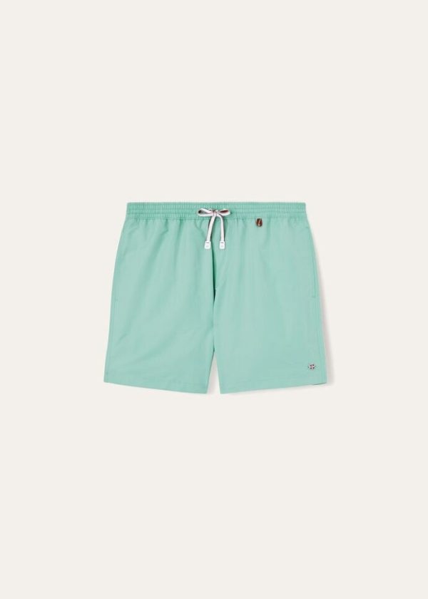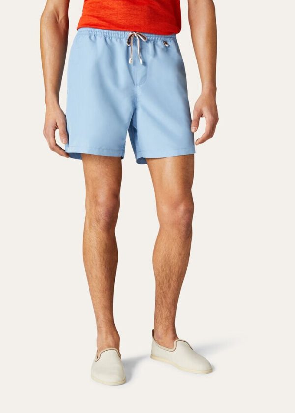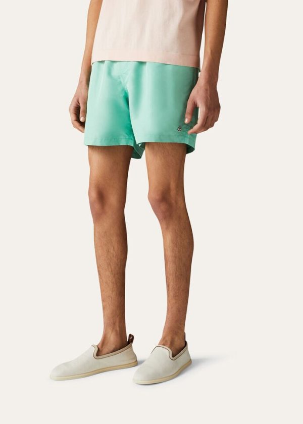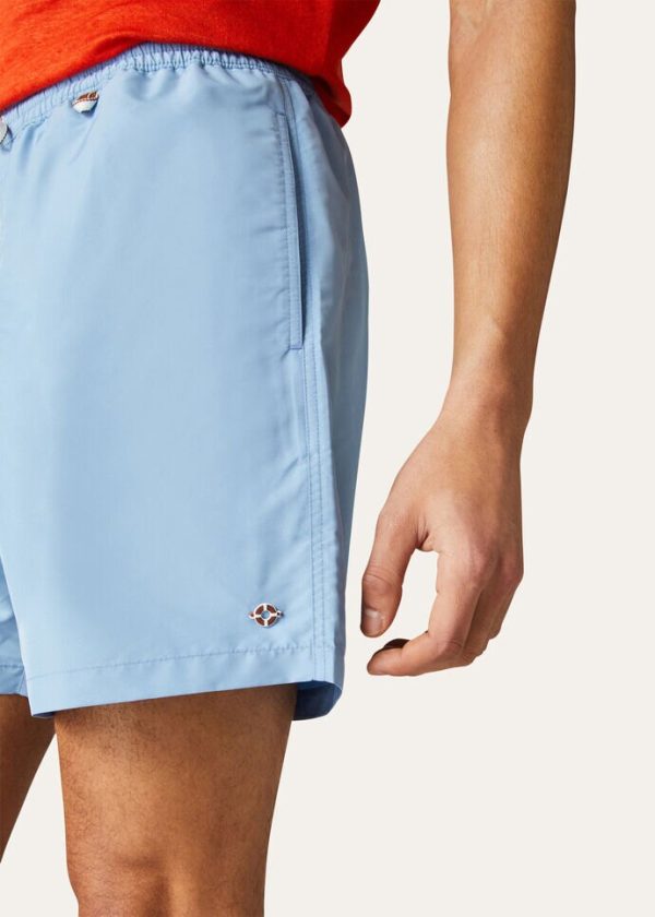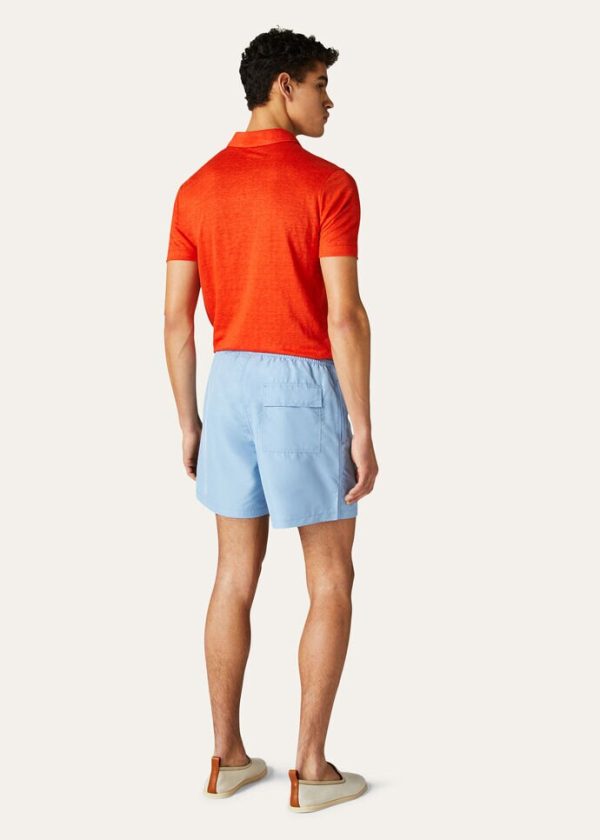 Enjoy the holidays in warm, exotic, seaside locales in pastel shades and lightweight textures. Crafted from technical fabric, these solid-colored swim trunks feature a mid-thigh length. They are enhanced with a small enameled eyelet in the shape of a life preserver, handsewn on the left side. Thanks to an adjustable drawstring waist and water-repellent treatment, they are extremely comfortable, practical and functional.